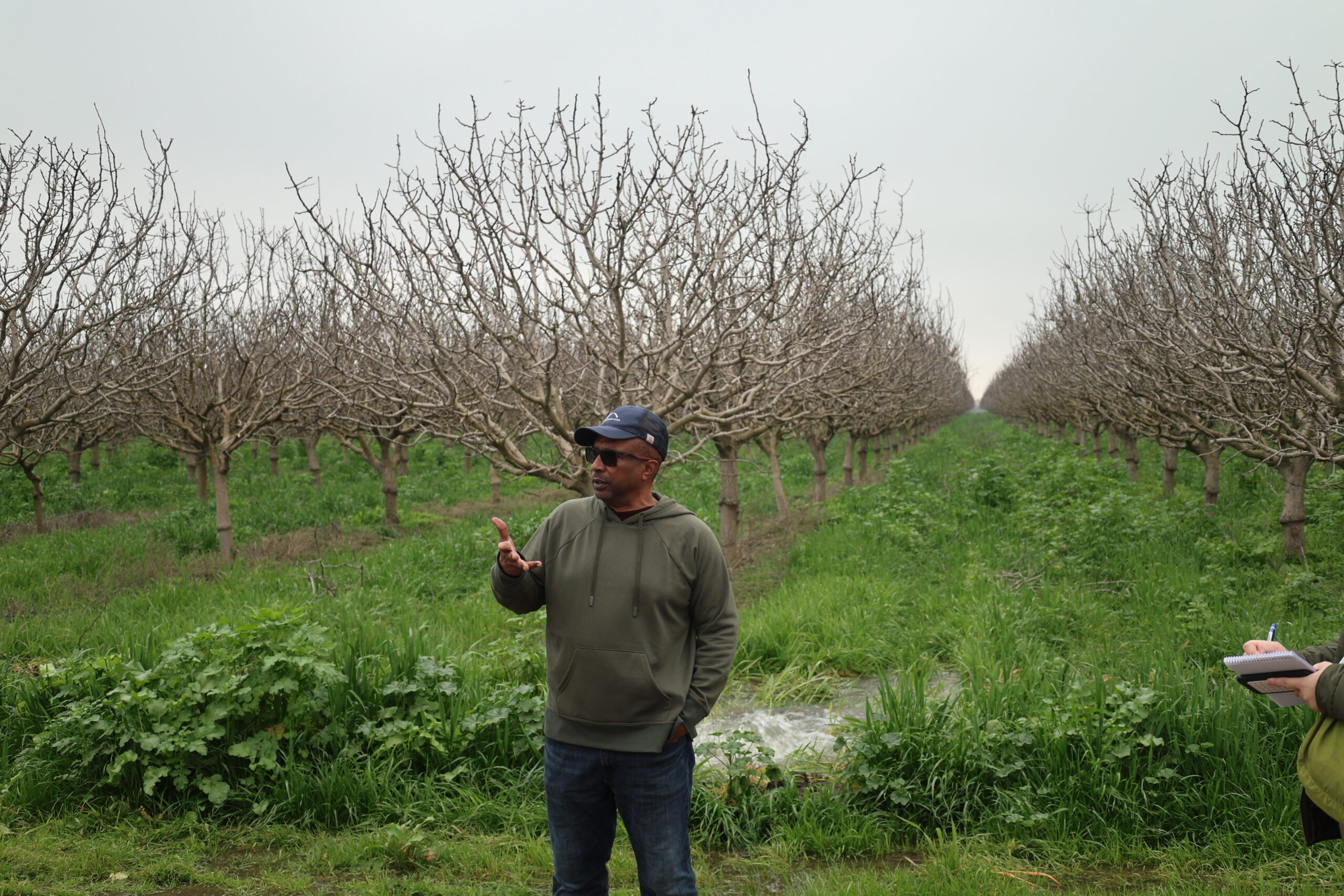 Project partners from Sustainable Conservation, American Pistachio Growers, California State University, Fresno, and participating growers were joined by observers from the Mid-Kaweah Groundwater Sustainability Agency (GSA), Tulare Irrigation District (TID), and media group SJV Water. Pilot project grower Jimi Valov guided attendees through the steps involved in establishing a cover-cropped orchard and preparing it for winter recharge, with active recharge taking place just behind him.