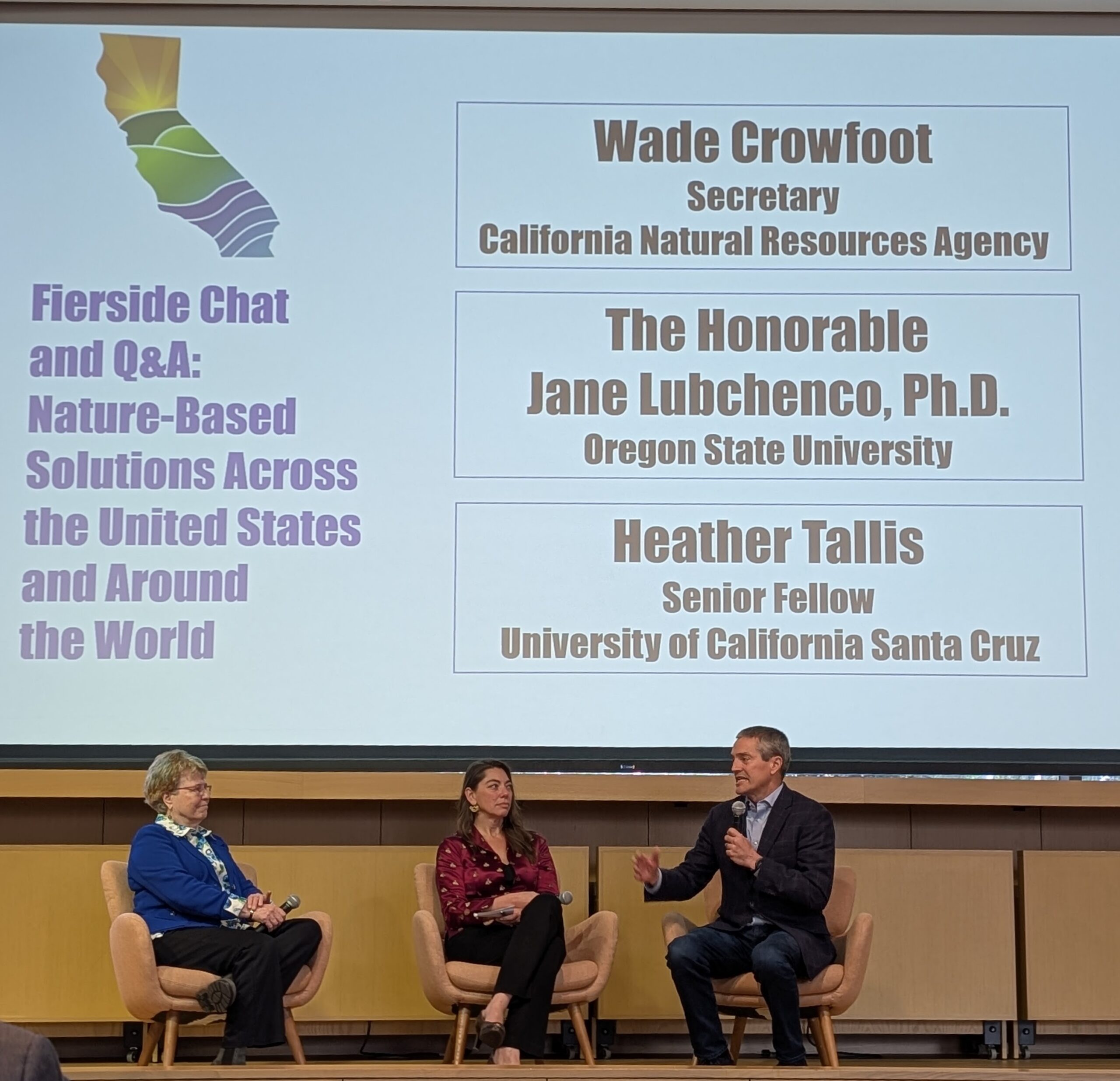 In a fireside conversation, California Secretary of Natural Resources Wade Crowfoot joined Dr. Jane Lubchenco (Oregon State University) and Dr. Heather Tallis (University of California, Santa Cruz) to discuss what it will take to integrate nature into decision-making at all levels.