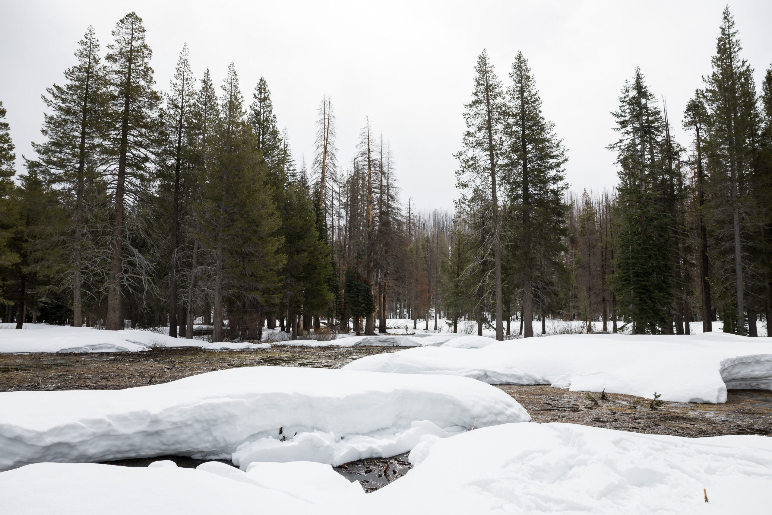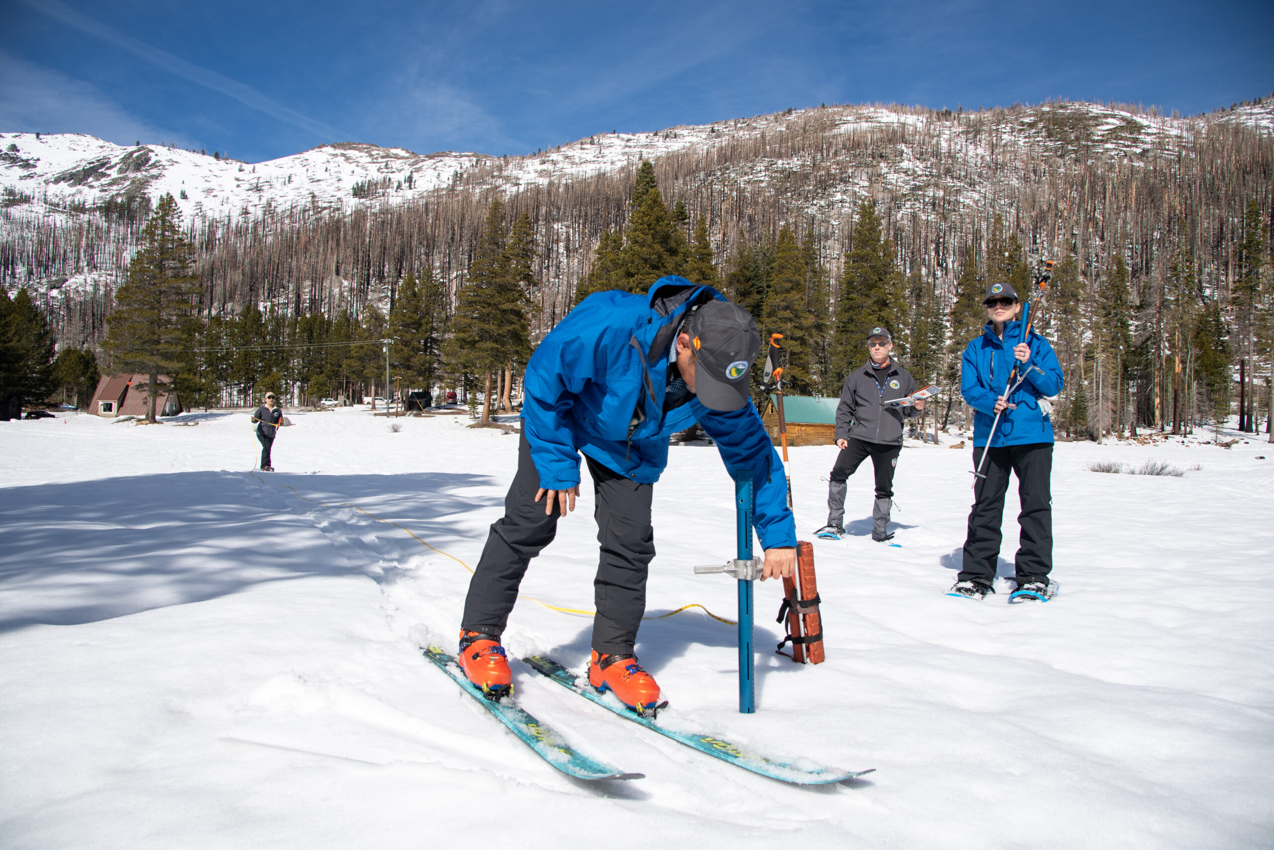 Left: DWR conducts a snow survey in February 2026 (Ken James/ CA DWR), Right: Water from snowmelt puddles in a Sierra Nevada meadow (Xavier Mascareñas / CA DWR)