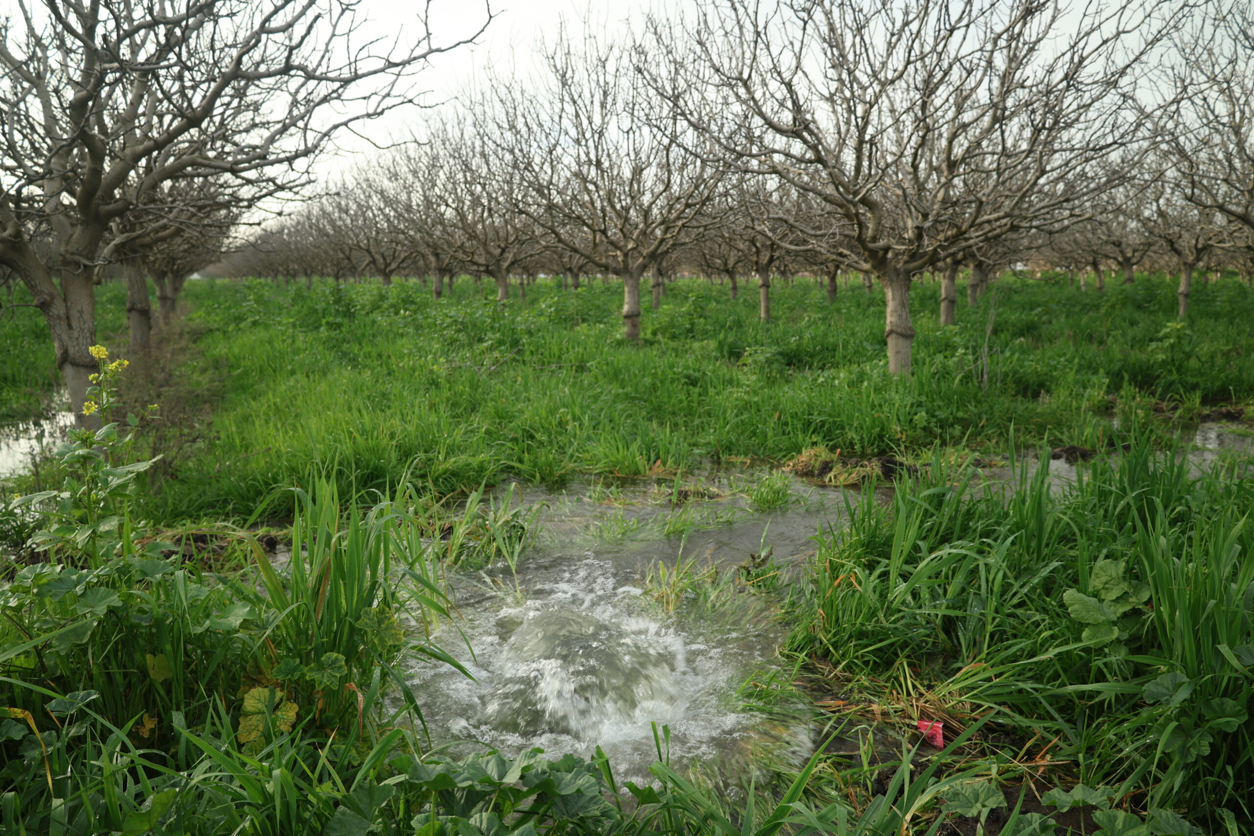 Top left: On-farm recharge with migratory birds in the field; Top right: Recharge pond (Kelly M. Grow/ CA DWR), Bottom: On-farm recharge on cover-cropped pistachio orchard