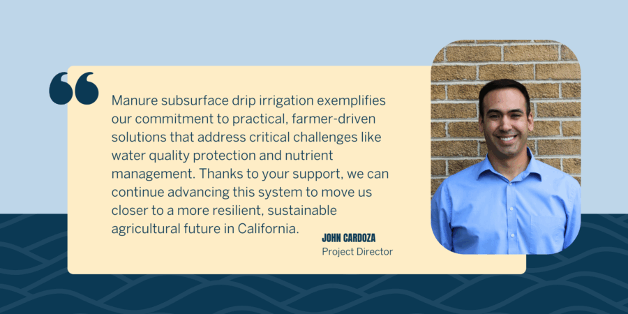 Because of your support in 2024, Sustainable Conservation and our partners continued to pioneer and scale on and off-farm solutions like the manure subsurface drip irrigation system (MSDI) that protect water quality and quantity, agricultural productivity, and human health.